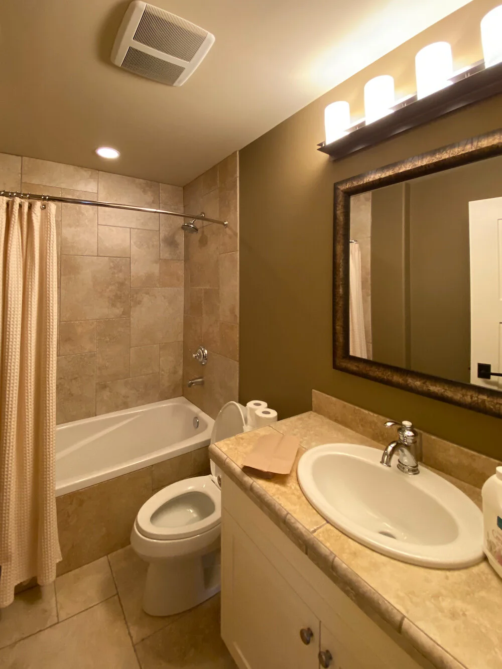 Yep, these lucky clients have a fantastic backyard that features a great pool area. We couldn't leave out this space when revamping the basement. The wet path from the back was replaced with a durable porcelain tile in a herringbone pattern for durability. We sprayed the existing vanity and added a new vanity top, lighting, and mirror to bring this space out of the early 2000s.